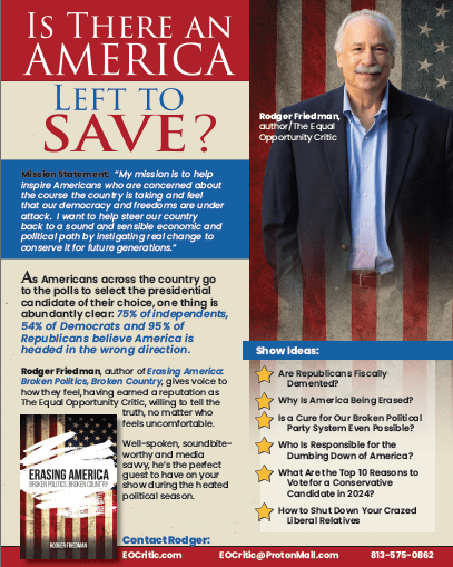 Rodger Friedman, a dedicated American who wants to help fix our broken country. His epiphany moment came when he realized that many Congressional Democrats and the entire executive branch were turning America into a socialist society, bankrupting the nation, erasing our borders, installing a one-party government, and ignoring the Constitution. He picked up his pen and started writing a series of weekly memos which became the basis for this book. Rodger is a retirement wealth planner, living in Florida with his wife.